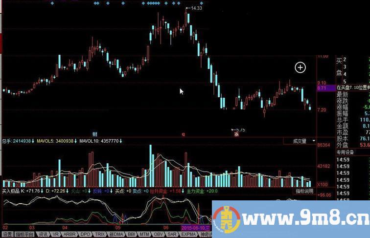 抄底逃顶的极品公式,黄白线交叉,显示红柱抄底,红线绿线危险系数大于900对映逃顶。很不错的指标,适合上升趋势操作,下降趋势无用。