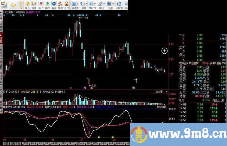 大势已去:IF(CROSS(黑马线,A1)AND 黑马线>70 AND 趋势线>80,90,100),COLORFF0000;