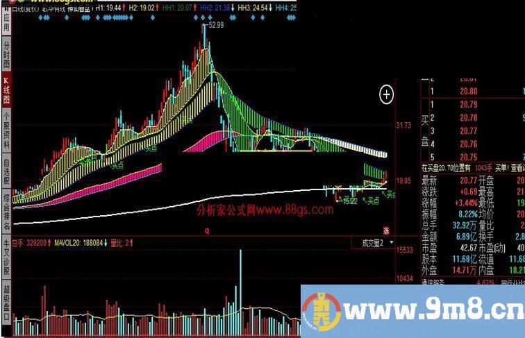 STICKLINE(HH1 STICKLINE(HH3>HH4,HH3,HH4,8,0),colorlimagenta; STICKLINE(HH3 STICKLINE(CLOSE>0 ,CLOSE,OPEN,10,0),color000000; STICKLINE(OPEN>CLOSE ,CLOSE ,OPEN,9,0 ),COLOR999900; STICKLINE(OPEN>CLOSE ,CLOSE ,OPEN,8,0 ),COLORbbbb00; STICKLINE(OPEN>CLOSE ,CLOSE ,OPEN,6,0 ),COLORcccc00; STICKLINE(OPEN>CLOSE ,CLOSE ,OPEN,4,0 ),COLORdddd00; STICKLINE(OPEN>CLOSE ,CLOSE ,OPEN,2,0 ),COLOReeee00; STICKLINE(OPEN>CLOSE ,HIGH,LOW,2,0 ),COLORffff00; STICKLINE(CLOSE>=OPEN ,CLOSE,OPEN,9,0) ,COLOR000099; STICKLINE(CLOSE>=OPEN ,CLOSE,OPEN,8,0) ,COLOR0000bb; STICKLINE(CLOSE>=OPEN ,CLOSE,OPEN,6,0) ,COLOR0000cc; STICKLINE(CLOSE>=OPEN ,CLOSE,OPEN,4,0) ,COLOR0000dd; STICKLINE(CLOSE>=OPEN ,CLOSE,OPEN,2,0) ,COLOR0000ee; STICKLINE(CLOSE>=OPEN ,HIGH,LOW,2,0 ),COLOR000fFF; A2:=MA(C,18);/////公式网 www.gszb.com A3:=(C-A2)/A2*100>=-9.9 AND C