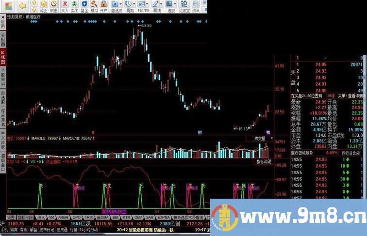 DRAWTEXT(VAR1,50,'死'),coloryellow; DRAWTEXT(VAR2,50,'生'),coloryellow; 资金趋势:EMA(30*(C-LLV(LOW,34))/(HHV(H,34)-LLV(LOW,34)),3)*3, colorred,LINETHICK1; VAR3:=IF(TROUGHBARS(3,16,1)=0 AND HIGH>LOW+0.04,4,0); 买点:= VAR3,colorred; DRAWTEXT(买点>0,45,'低吸点'),colormagenta; STICKLINE(买点,0,50,2,0),colormagenta,LINETHICK1; 有未来函数