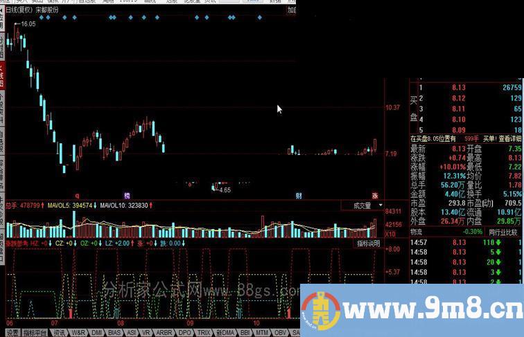通过转向函数编写的涨跌参考,可以辅助判断波段的顶底情况 HZ:FLATZIG(1,5)*8,colorred; CZ:FLATZIG(3,5)*5,coloryellow; OZ:FLATZIG(0,5)*3,colorgreen; LZ:FLATZIG(2,5)*2,colorcyan; 涨:IF(HZ=0 AND CZ=0 AND OZ=0 AND LZ=0,1,0); 跌:IF(HZ=8 AND CZ=5 AND OZ=3 AND LZ=2,1,0);