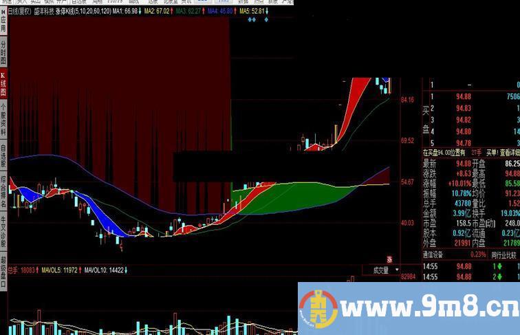 DRAWBAND(MA(CLOSE,5),RGB(200,0,0),MA(CLOSE,10),RGB(0,0,255));