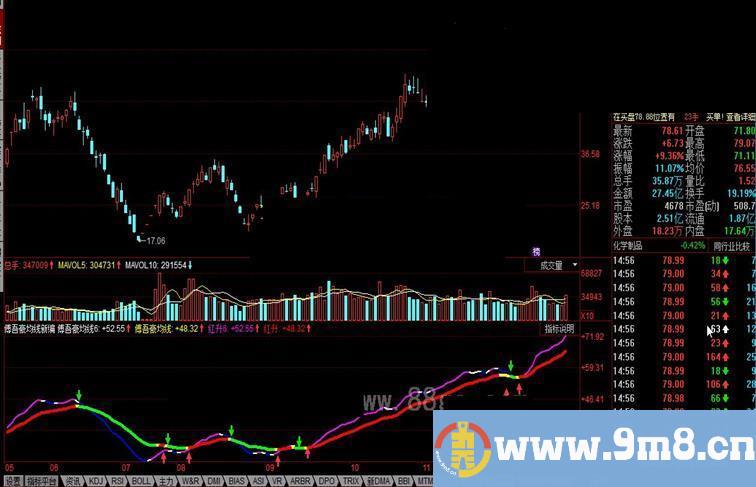 红色箭头为买入参考信号,绿色箭头为卖出参考信号;当没有出现卖出参考信号,而出现红色箭头时,为加仓信号。傅吾豪18日均线使用方法请参阅读《操盘圣经》(第二版)或者百度吧。