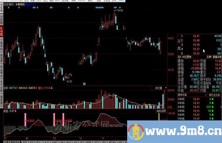VARB:=CLOSE>MA(CLOSE,30) AND CLOSE VARC:=MA(CLOSE,30)>REF(MA(CLOSE,30),1); VARD:=BARSLAST(CROSS(MA(CLOSE,5),MA(CLOSE,10))) VARE:=0-"MACD.DIFF"(7,21,3); VARF:=TROUGHBARS(3,15,1)<4; VAR10:=EMA(CLOSE,30)>REF(EMA(CLOSE,30),2); VAR11:=IF(VARF=1,50,0); 多空:EMA((CLOSE-MA((2*CLOSE+HIGH+LOW)/4,30))/MA((2*CLOSE+HIGH+LOW)/4,30)*100,3),colorwhite; 0,colorred; STICKLINE(FILTER(VARF=1,5) AND 多空<-10,50,0,15,0),colorf00ff0; STICKLINE(FILTER(VARF=1,5),50,0,8,0),coloryellow; DRAWTEXT(FILTER(VARF=1,3),25,'奶爸看底'),colorred ; STICKLINE(多空<-10,0,多空,0.85,0),coloryellow; STICKLINE(多空>10,0,多空,0.95,0),colorred;