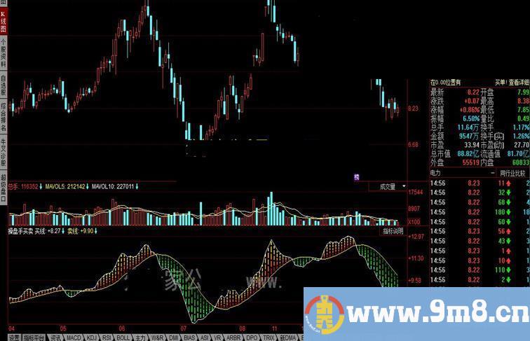 3.当白线向下击穿黄线为卖出信号,此时柱差显示威绿色系频谱。