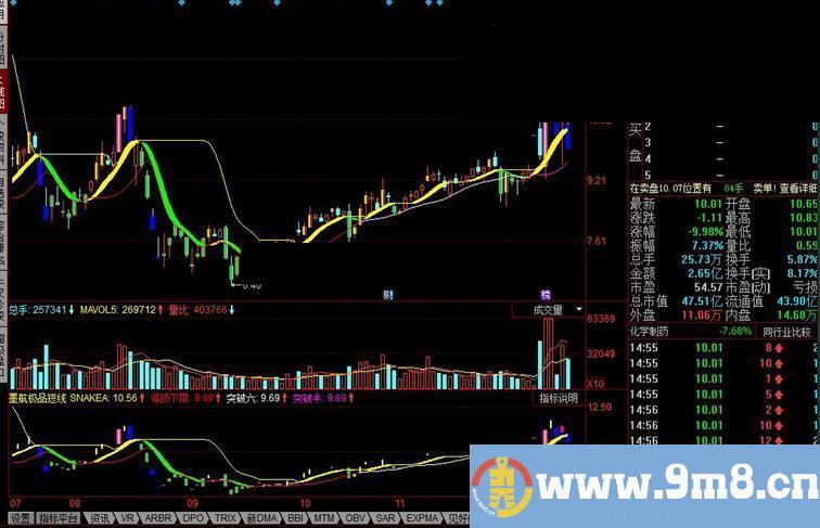 STICKLINE(C 成交量大于10日均量线和20日均量线k线变红色:=((VOL>=MA(VOL,10) ) AND (VOL>=MA(VOL,5) ) AND C>O ) ; STICKLINE(成交量大于10日均量线和20日均量线k线变红色,OPEN,CLOSE,4,0),coloryellow; m5:=MA(C,5),coloryellow; m10:=MA(C,10); m20:=MA(C,20); 短期均线多头排列:=C>m5 AND m5>m10 AND m10>m20 AND C>REF(C,1) AND m5>REF(m5,1) AND m10>REF(m10,1) AND m20>REF(m20,1) AND C/O>1.03 AND (H-C)/C<0.02; 五日均线角度大于:=ATAN((MA(C,5)/REF(MA(C,5),1)-1)*100)*180/3.14159>50; k线变色条件1:=五日均线角度大于 AND 短期均线多头排列 ; STICKLINE(k线变色条件1,OPEN,CLOSE,8,0),colorlimagenta,linethick1; 涨停:=IF(REF(C,1)*1.1-C<0.01 ,1,0); STICKLINE(涨停,OPEN,CLOSE,10,0),colormagenta; 成交量大于10日均量线和20日均量线k线变红色:=((VOL>=MA(VOL,10) ) AND (VOL>=MA(VOL,5) ) AND C>O ) ; STICKLINE(成交量大于10日均量线和20日均量线k线变红色,OPEN,CLOSE,4,0),coloryellow; C3:=REF(C,1); 跌停:=IF((C3-C)*100/C3>=(10-0.01*100/C3),1,0); STICKLINE(跌停,OPEN,CLOSE,10,0),colorblue; B1:=MA(C,1);///www.9m8.cn B2:=SMA(SMA(SMA(B1,2,1),2,1),2,1) ; SMA2:=MA(B2,3) ; FILLRGN(b2,sma2,b2>sma2,RGB(255,255,0),b2 snakeA:HHV(MA(B2,1),13),coloryellow; 停损下限:IF(LLV(MA(B2,7),3) 多空趋势60:=MA(CLOSE,60); 半年线:=MA(CLOSE,120); 年线:=MA(CLOSE, 250); 突破六:IF(C>=多空趋势60 ,停损下限,DRAWNULL),colorwhite,linethick1; 突破半:IF((C>=半年线) ,停损下限,DRAWNULL),colormagenta,linethick1; 突破年:IF((C>=年线) ,停损下限,DRAWNULL),colorliblue,linethick1,nodraw;