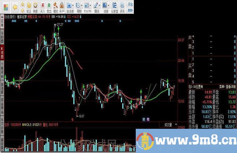 AA线=绿买红卖,AA线变红时应当注意卖点即将出现;AA、CC同时变红CC下插AA时是大跌临界点(注意区分)!cc、AA线同时变绿时可以大胆买进。买进、卖出点都有滞后现象,尤其是卖出点应结合其他指标适当纠偏;