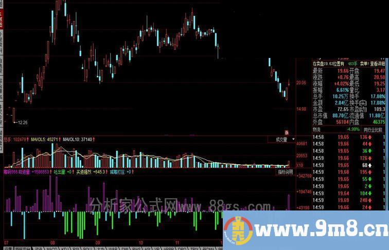 VURN:=IF(VURB VURT:=IF(VURA AND VURS,VURF/10000,0); VURL:=IF(VURA AND VURB 吸进量:VURH,POINTDOT,COLORFF00FF; 吐出量:VURN,POINTDOT,COLOR10FF10; 买进强烈:VURT,POINTDOT,COLOR10FFFF; 减筹打压:VURL,POINTDOT,COLORFFF516; STICKLINE(VURB>VURC,0,VURE,8,1),COLORFF00FF; STICKLINE(VURB STICKLINE(VURA AND VURS,0,VURF,8,0),COLOR10FFFF; STICKLINE(VURA AND VURB