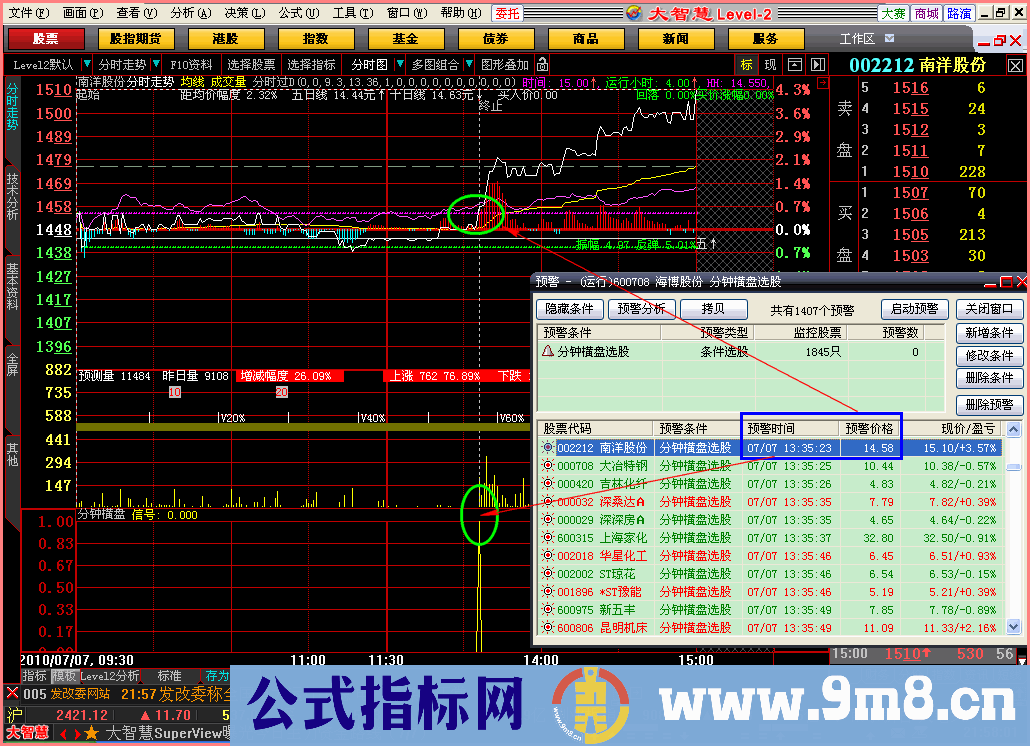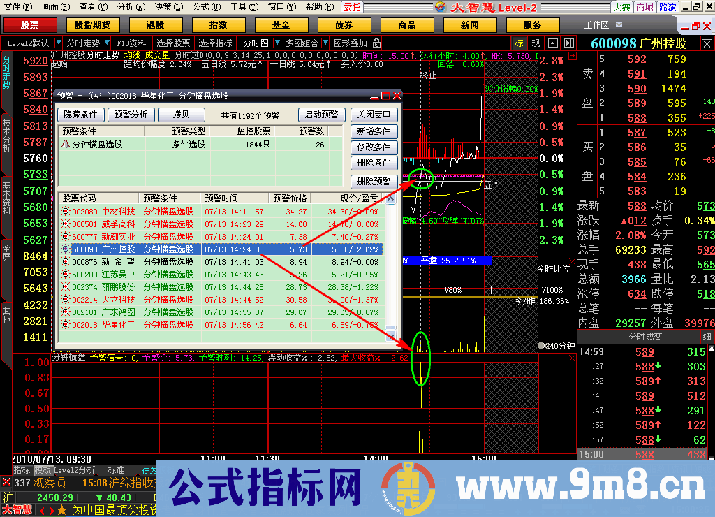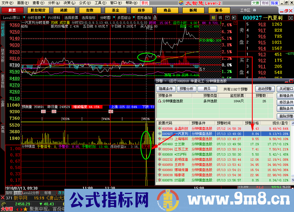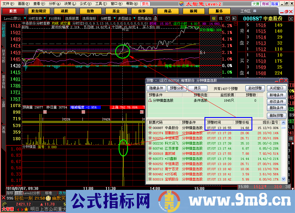 《大智慧分时图公式实施预警一例》附预警公式(加密)