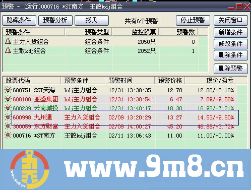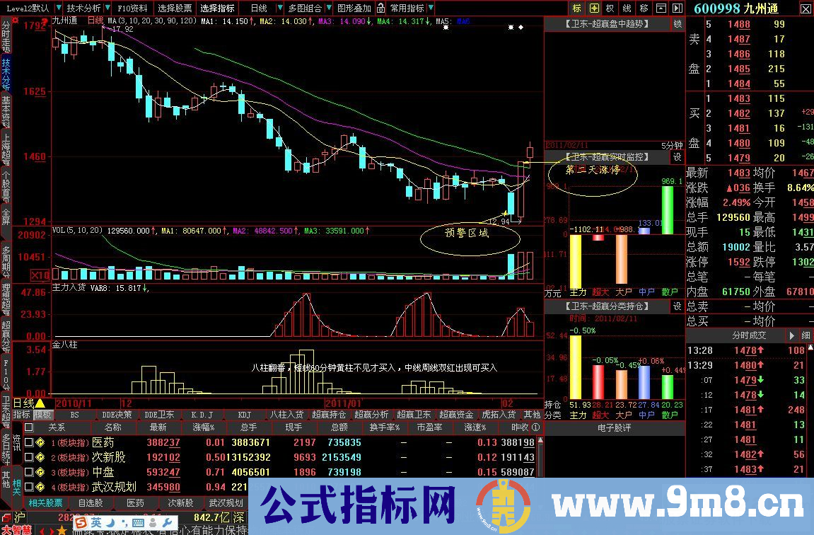 将 主力入货 分时和日线设为预警指标,选中一个涨停板股票。过程如下: