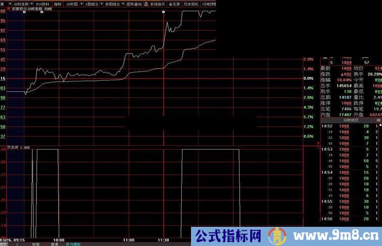 这三天在家整理了一下原来编的指标,我把我认为有用的分享给大家,先是追涨停指标,分3个版本(分时,5f,30f),一个一个来。第一个是分时版,我的理念就是分时图放量,并且是大单买入,因为大单和上涨的关系就好比是人和人民币的关系一样,有大单不一定上涨,但是,如果没有大单,上涨绝对是不持续的,也就是没有操作意义。先上个图: