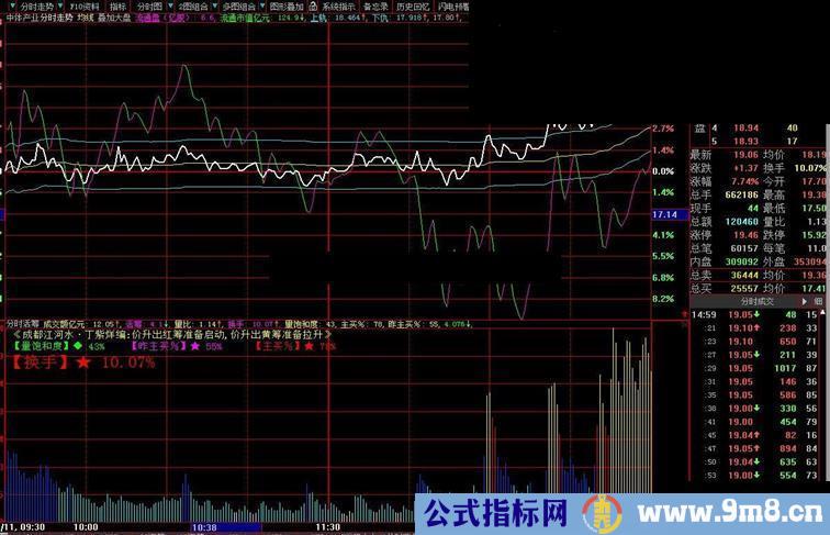 该指标是对股票当天能量的预测以及与前一天成交量的对比。为了方便区分分时图中成交量的量能的级别,我们把活筹(分时成交量)分为了六种不同的颜色:地量为白色为昨天此时成交量的0.3以下,浅兰色为昨天此刻量的0.3-1之间,即我们所说的低换手低于昨天的分钟均量,对这样的股票,您可以先不考虑;然后是蓝色,昨天此刻量的1-2倍,表示今天的量能大致与昨日持平稍多;接下来是红色,昨天此刻量的2-3,该颜色表示今日的量能具有启动的可能,也就是说当活筹换手达到红色区域时,开始放量了,如是上涨时出的,我们才可以考虑买入;而黄色,昨天此刻量的3-6.5倍,为明显放量,若股价在上升时出现黄色,表示股票已具备了拉升条件;最后是紫色,昨天此刻量的6.5倍以上,表示超大换手,达到该区域的量能具备双刃剑的效果,有些股票可能放量见顶,也有些股票可能在巨量推动之下接连拉上涨停。