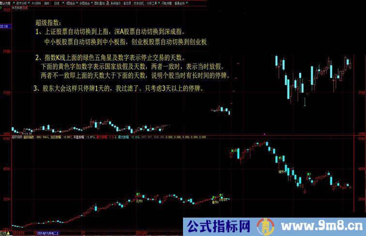 2、超级指数用在个股副图上,呈现K线形态。超级指数K线上面的绿色五角星加数字,表示当时停止交易的天数(未必停牌)。下面的黄色文字加数字表示国家放假和放假天数。当上面的数字和下面的数字一样时,表示国家放假,股市停止交易。当上面的天数大于下面的天数时,或只有上面天数时,表示个股当时停牌,停牌天数即绿色数字。