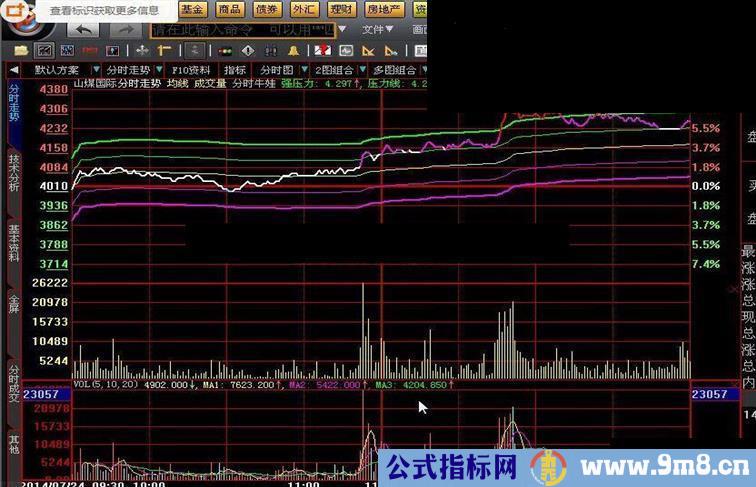 压力线:IF(SUM(C*VOL,M)/SUM(VOL,M)>0,IF(SUM(C*VOL,M)/SUM(VOL,M)*(1+(N/2000))>=DYNAINFO(3)*1.1,DYNAINFO(3)*1.1,SUM(C*VOL,M)/SUM(VOL,M)*(1+(N/2000))),IF(C*(1+(N/2000))>=DYNAINFO(3)*1.1,DYNAINFO(3)*1.1,C*(1+(N/2000)))),color00ff00,LINETHICK1,layer1;