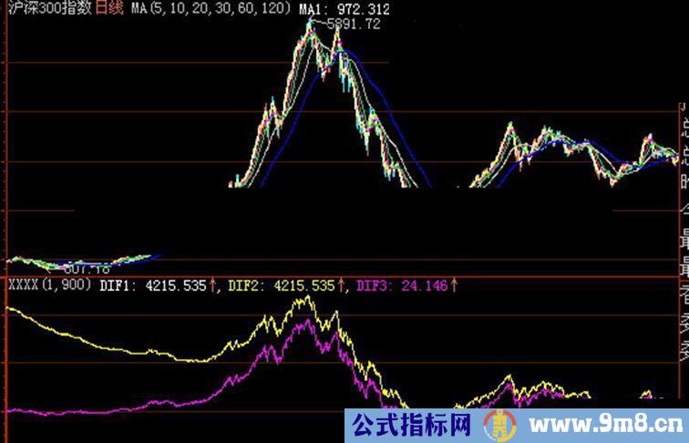 DIF1=DIF2,这个是可以严格证明的。因此图线上看应该不会多于2条线。当SHORT和LONG差别不是太大的话,肉眼只看到1条线,应该是电脑计算精度所限,基本相等。如果两个参数差别很大的话,例如SHORT=1,LONG=900,则DIF1和DIF3两条曲线的差别很大。详见下面图示。