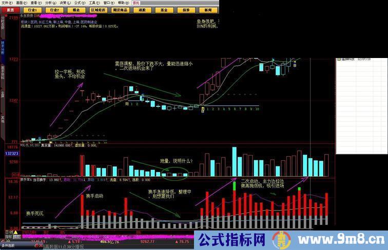 注意:地量的出现,换手率的再次降低到不活跃,说明机会要来了,大家要睁大眼睛了,此时就是我们小散进场的好时机了,15-18日,换手渐大,接近了异动线,启动线开始向上,股价的抬高,特别是半年线的有力支撑(大家可以用半年线看一下),就要果断买进,等庄家抬轿吧。中间出现两次绿柱的超过15%换手的大量,说明主力在有部分出货现象,我们也可跟着做高抛,然后在低点接回来,(每次接回的资金比例大家应把握好)。大家看到此段时间换手率一直维持在红柱区,说明参与的人真不少。直到本月18日为止,都在可操作区间,跟着主力高抛低吸是不成问题的,当然此股已经涨了这么多,顶部也快形成了,此时的换手就应该注意了--该收手就收手吧。。