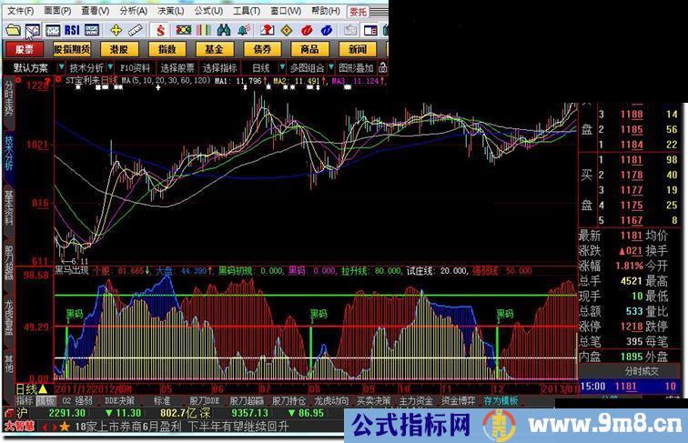 黑码初现:IF(CROSS(个股,9),50,0),STICK,LINETHICK3,COLOR00FF00;