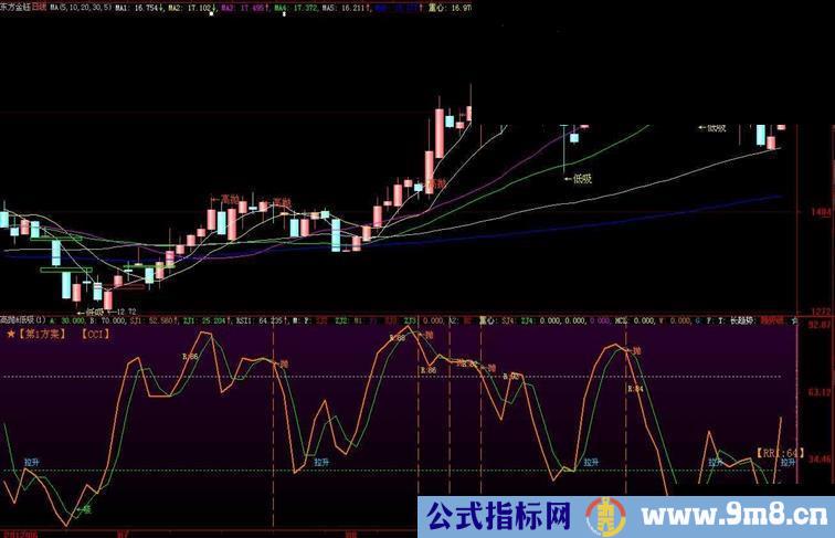 DRAWTEXT(CROSS(ZJ,SJ) AND SJ>70,H+0.05,'←高抛'),COLOR00FFFF;};