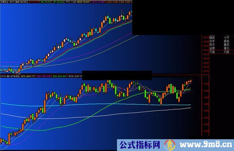 分析个股的强弱,少不了要对比大盘的走势,因此一直用大盘指数副图指标来配合个股的分析,一直以来用的是分析家,大智慧,但这两款软件的大盘函数只对应上证和深证,不包含中小板和创业板指数,应用上未免先天不足,无法满足结构性行情的需要(这方面通达信要好一些)!经过长时间的观察发现,沪深300指数的走势和上证大盘吻合度很高,深成指次之,中小板联动性不强,创业板联动最差。究其原因,沪深300指数里面的成分股,深成指入选68支,占比22.7%, 中小板35只, 占比 11.7% ;上证入选197只,占比65.7%;创业板没有一只入选。这也就意味着如果还以大智慧现有的大盘函数来做指数副图,偏差会越来越大了!根据以上的分析,我将整个市场的股票重新分配到不同的指数里面,分析的准确性也就有了明显的提高!大家可以参考使用