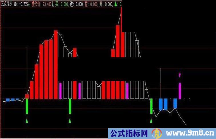 买:if(cross(c,操作价) and 蓝柱 AND REF("KDJ.J",1)<0 AND "KDJ.J">0,0.8,0),STICK,Color00FF00,linethick1;