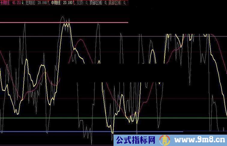 顶部区域:(中期线80) and (ref(短期线,1)>95 or ref(短期线,2)>95 ) and 长期线>60 and 短期线<83.5