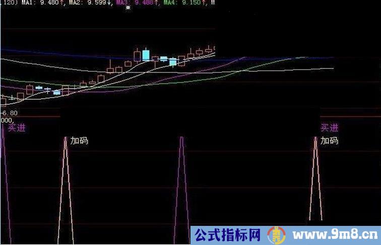 加码:if(CROSS(CLOSE,加码价) AND 加码价>REF(加码价,1),68,0),COLORYELLOW ;