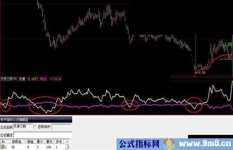 LC := REF(CLOSE,1); RSIV:=SMA(MAX(CLOSE-LC,0),N1,1)/SMA(ABS(CLOSE-LC),N1,1)*100; RS1:=SMA(MAX(CLOSE-LC,0),N1,1); RS2:=SMA(ABS(CLOSE-LC),N1,1); 天使:(RS1*8*4)-(RS2*8),linethick2,color00ffff; 吻线:(RS2*8/4)-(RS1*8),linethick2,colorff00ff;