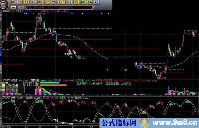 DRAWTEXT(买入线>76.5 AND CROSS(卖线,必卖线),l,'进'),ALIGN1;