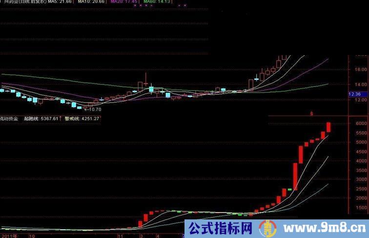 VAR1:=SMA(AMOUNT/10,10,1)/10000; VAR2:=REF(VAR1,1); VAR3:=SMA(AMOUNT/10,10,1)/10000; 资金运转:STICKLINE(VAR1>VAR2,VAR1,VAR2,2,0),COLORRED; 资金流失:STICKLINE(VAR1 起跑线:MA(VAR1,5); 警戒线:MA(VAR1,10),COLORYELLOW; 分界线:MA(VAR1,20),COLORCYAN;