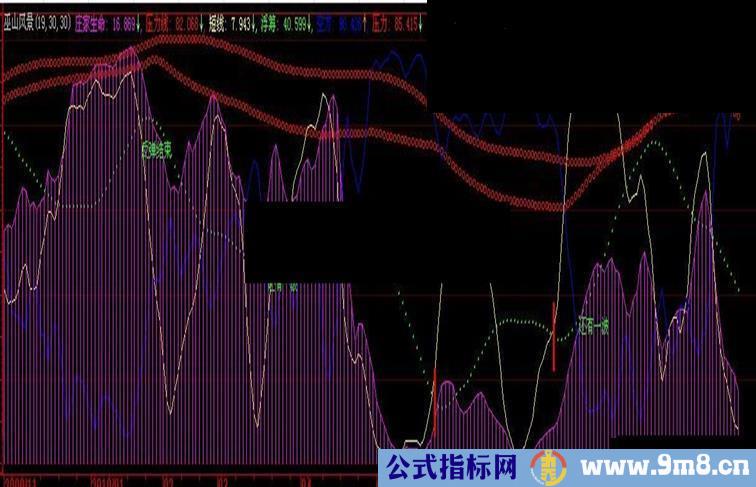 压力线: EMA(((HHV(AA,n2)+LLV(AA,n2))/2)/1,N1)+30,CIRCLEDOT,COLORRED;