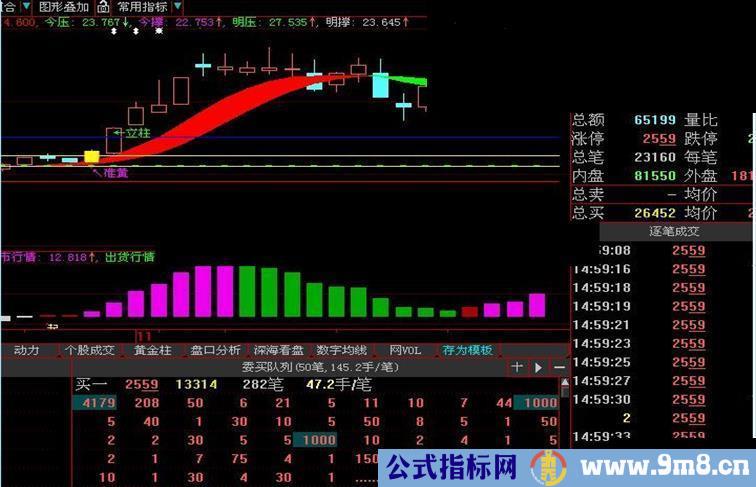 行情出现:IF(A10,5,0),LINETHICK0,COLOR00AAAA;