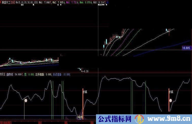 卖:IF(((CROSS(波段鬼,波段王) or CROSS(波段鬼,趋势线)) or CROSS(波段王,趋势线)) AND (波段鬼>65),90,0),Stick,Linethick1,CoLor00FF00;