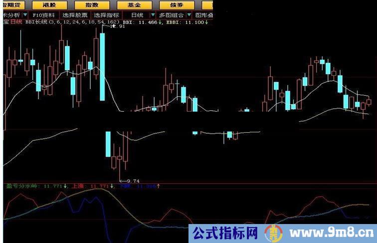 下跌:IF(A<盈亏分水岭,A,盈亏分水岭),colorblue;