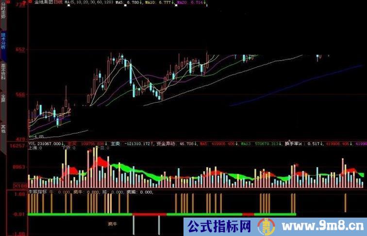 DRAWTEXT(CROSS(疯牛,0.5) AND COUNT(疯牛>0.5,10)=1,-0.4,'疯牛'),COLOR44bbff;