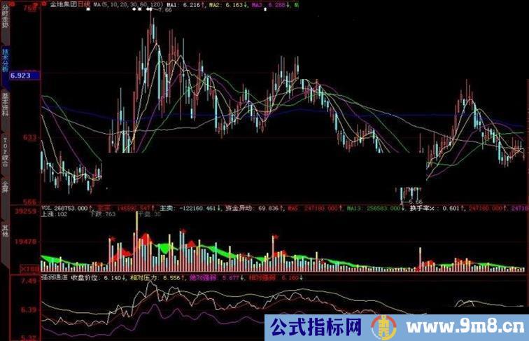 相对强弱:MA(((相对压力+绝对强弱)/2+C)/2,3),COLORRED;