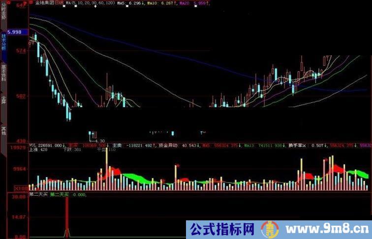 第二天买:IF((CLOSE-MIN(计算,再计算))/CLOSE<0.1 AND SUM(流通A,5)/5<1.8,10, 0),colorgreen;