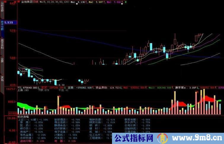 IF STKINDI('991007','涨幅引用.A')*100>=0 THEN BEGIN DRAWTEXTREL(x1,y5,'房地产: