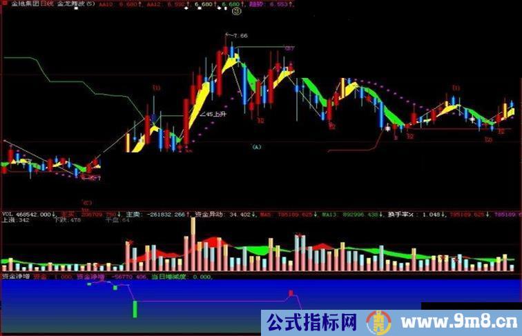 DRAWFLAGTEXT(DT>=0,资金净增,Str1+str2+str3),COLORRED;