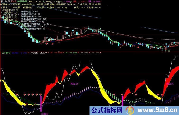 STICKLINE( CROSS(趋势线,0)AND 黑马线<40,-5,25, 5,0),COLORFF00FF;