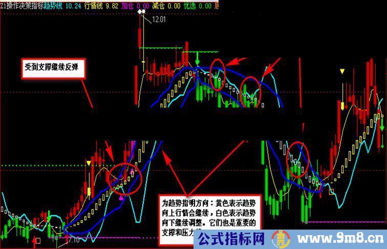 {STICKLINE(行情线>=趋势线,C,O,6,1),COLORRED;}