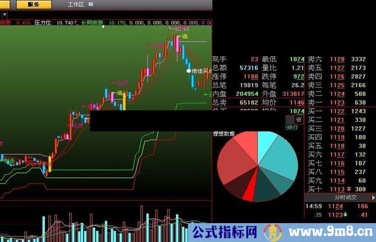 drawtext((((cross(var2c,upper) and (high < 压力一)) and ((xy - ref(xy,1)) > 0)) and (high < 支撑)),low,'←买'),colorffffff;