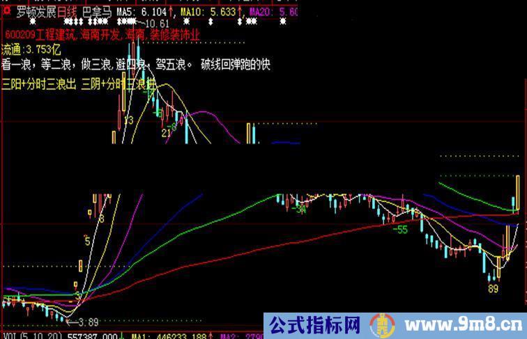 drAWTEXTABS(0,60,'三阳+分时三浪出 三阴+分时三浪进'),LINETHICK1,coloryellow,layer0;