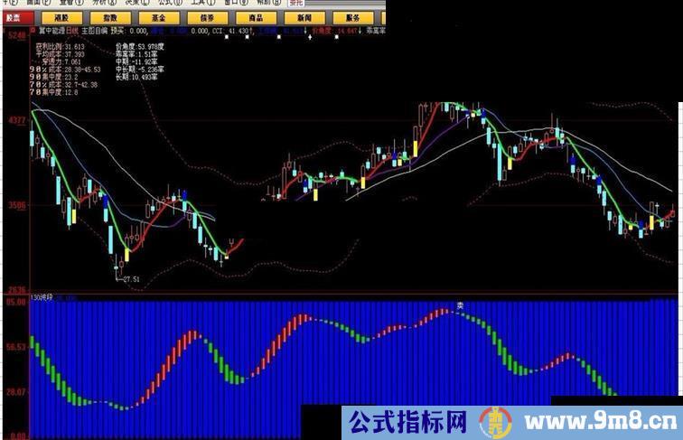 价角度:ATAN((cci/REF(cci,1)-1)*100)*180/3.1416,COLOR0000FF,LINETHICK0;