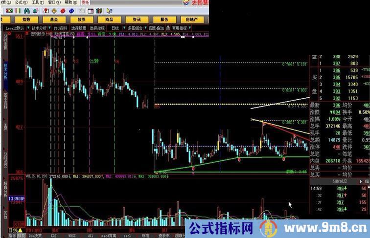 DRAWTEXT(FILTER(c=ref(c,k6),0),(HHV( h,80 )+LLV(l ,80 ))/2,'21转'),COLORGREEN,LINETHICK2;