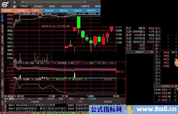 本指标就是针对上述问题编写的一个指标,在分时主图中加入了近10多个交易日的K线图,这样在查看分时主图时,就能够在不进行任何切换操作的情况下查看近来K线走势图以及自己专用的各个分时副图。
