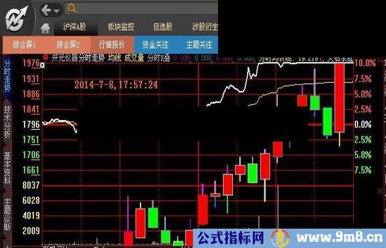 本指标就是针对上述问题编写的一个指标,在分时主图中加入了近10多个交易日的K线图,这样在查看分时主图时,就能够在不进行任何切换操作的情况下查看近来K线走势图以及自己专用的各个分时副图。