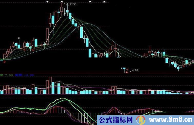 波段炒股主图指标:第一根黄线上穿第二条绿线买入,第一根黄线不下穿破第二根线就一直持股,穿破后就一直持币观望。图中的B,S可以去掉,一线为主。