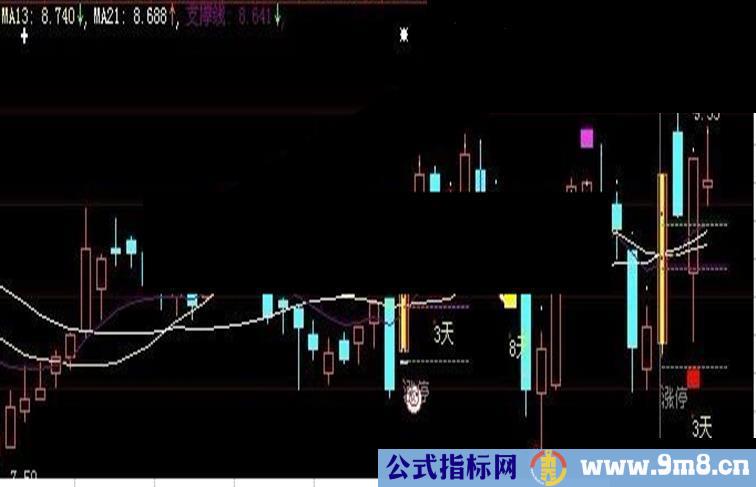 支撑线:(MA(CLOSE,3)+MA(CLOSE,6)+MA(CLOSE,12)+MA(CLOSE,24))/4;