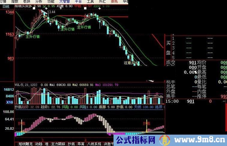 趋势:LLV(MA(H,13),1),COLORGREEN,LINETHICK2;