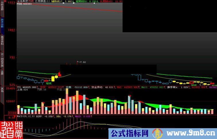 or (cross(sk,sd) and sk<=0.05 and (v/ma(v,5)>2 or c/ref(c,1)>0.035)) ,l*0.99,'短线'),colorgreen;